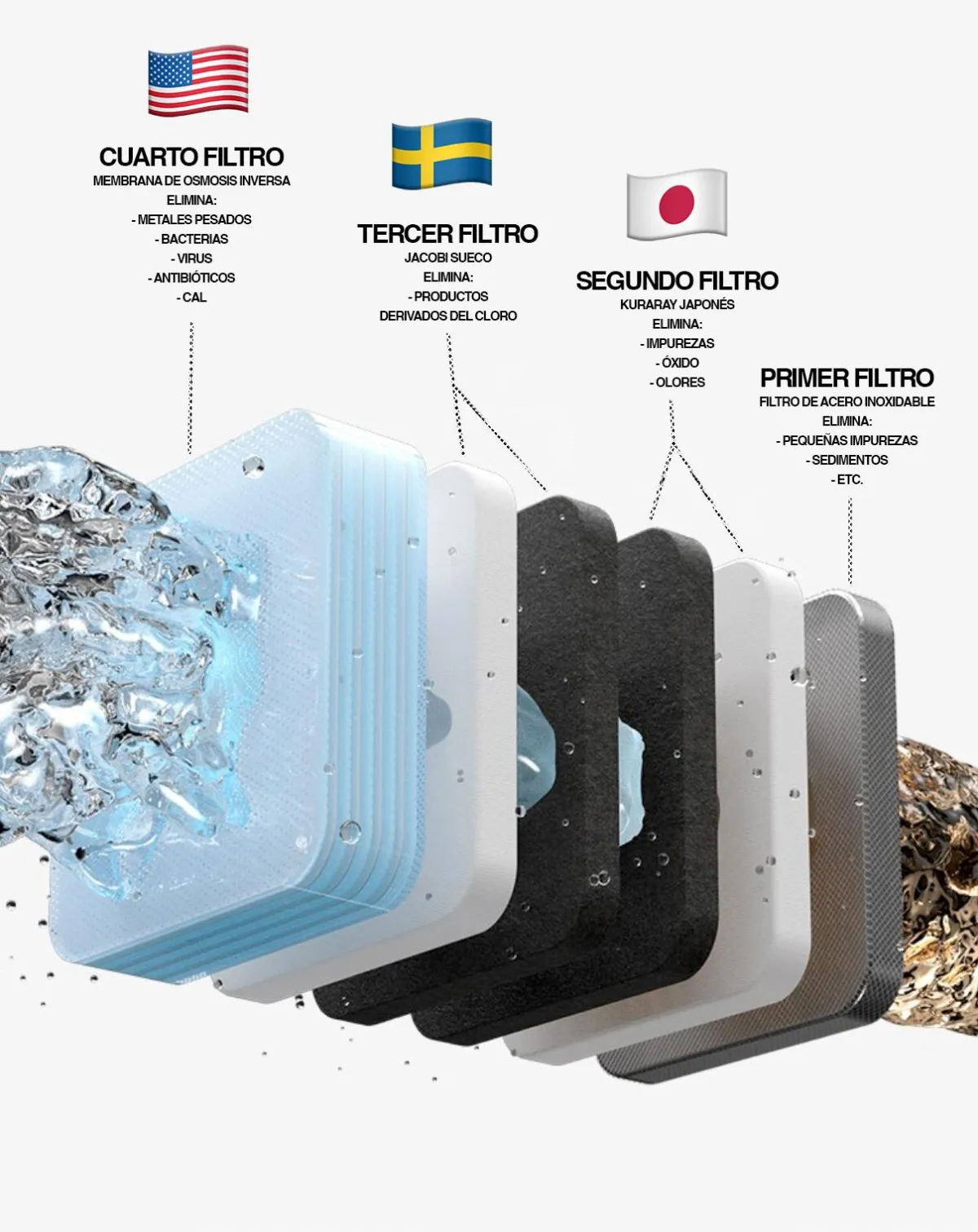 Su sistema único de filtrado múltiple, limpia paso a paso el agua que sale del grifo.